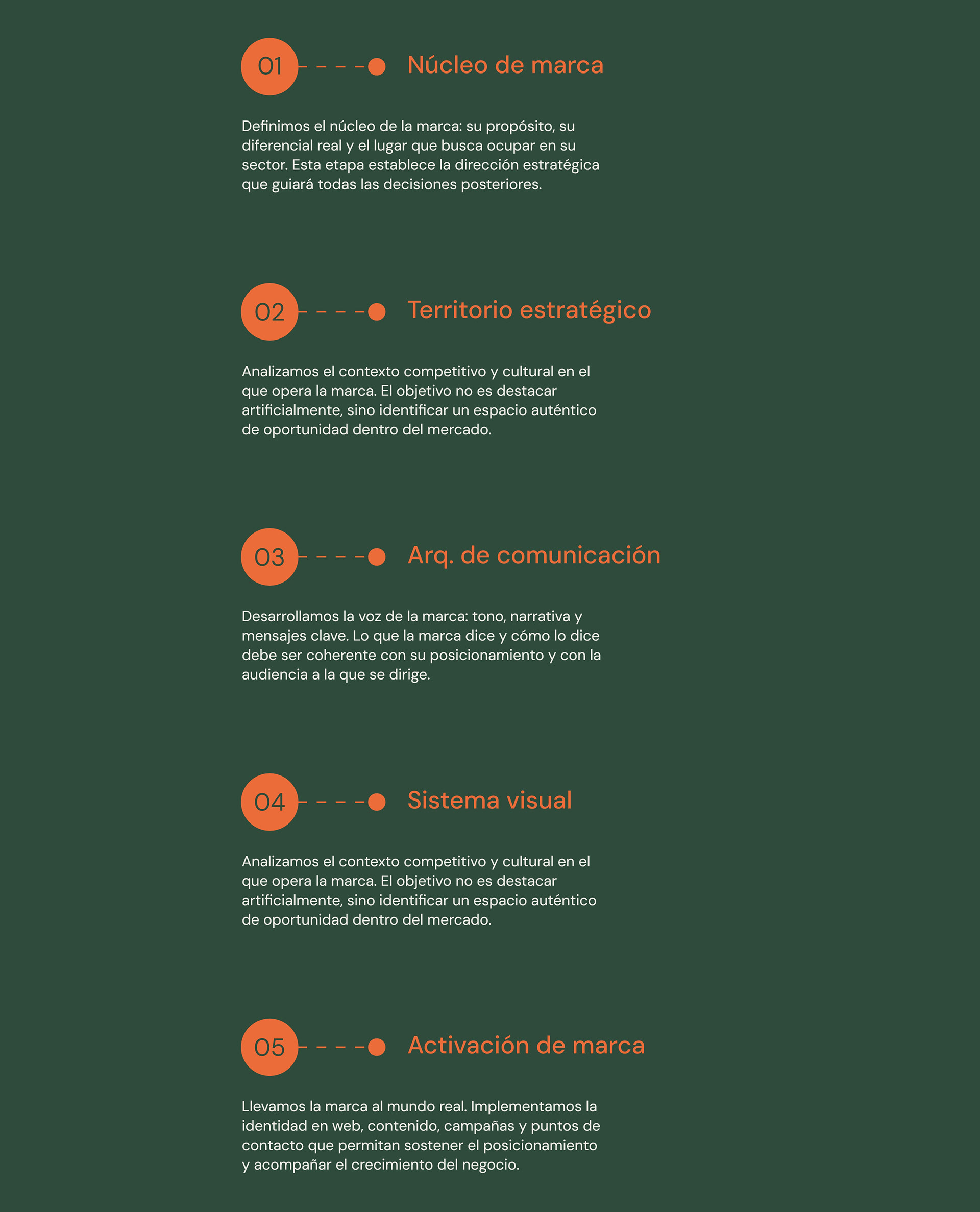 En Okta trabajamos las marcas desde adentro hacia afuera. Nuestro método se estructura en cinco etapas consecutivas que permiten tomar decisiones con claridad, reducir fricción y avanzar con foco. Cada etapa cumple una función específica dentro del proceso.